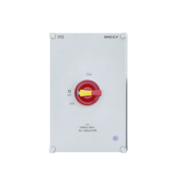 The EAS80 4-pole AC switch disconnect is designed to deliver safe and reliable power isolation for photovoltaic systems, power distribution panels, and industrial machinery. Rated at 125A and 800V, this heavy-duty switch features an IP66-rated insulated enclosure, ensuring full protection against dust and water ingress for both indoor and outdoor environments.